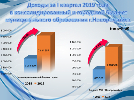 Поступления увеличены на 10,5% по сравнению с аналогичным периодом прошлого года. С учетом ранее доведенного увеличенного задания по доходам консолидированного бюджета, город Новороссийск занимает 3 место среди 44 муниципальных образований края по уровню исполнения консолидированного бюджета.