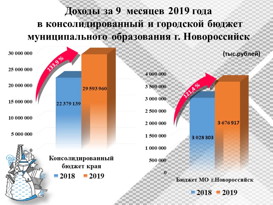 По итогам 9 месяцев 2019 года от налогоплательщиков города в консолидированный бюджет края перечислено свыше 29,9 млрд. рублей. Поступления увеличены на 133,9 % по сравнению с аналогичным периодом прошлого года. С учетом ранее доведенного увеличенного задания по доходам консолидированного бюджета, город Новороссийск по результатам исполнения годовых бюджетных назначений, занимает 2 место среди 44 муниципальных образований края и составляет 92,9%.