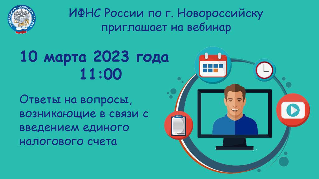 Инспекция ФНС России по г. Новороссийску в целях повышения эффективности налогового администрирования приглашает представителей организации (индивидуальных предпринимателей) принять участие в вебинаре по теме: «Ответы на вопросы, возникающие в связи с введением единого налогового счета», который состоится 10.03.2023г.в 11.00.