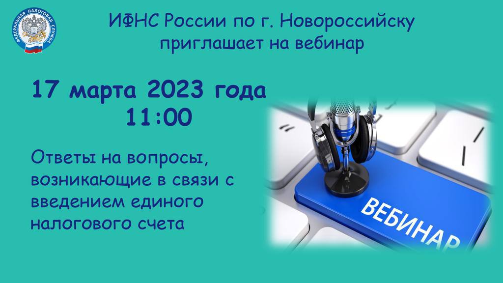 Инспекция ФНС России по г. Новороссийску в целях повышения эффективности налогового администрирования приглашает представителей организации (индивидуальных предпринимателей) принять участие в вебинаре по теме: «Ответы на вопросы, возникающие в связи с введением единого налогового счета», который состоится 17 марта 2023г.в 11.00.