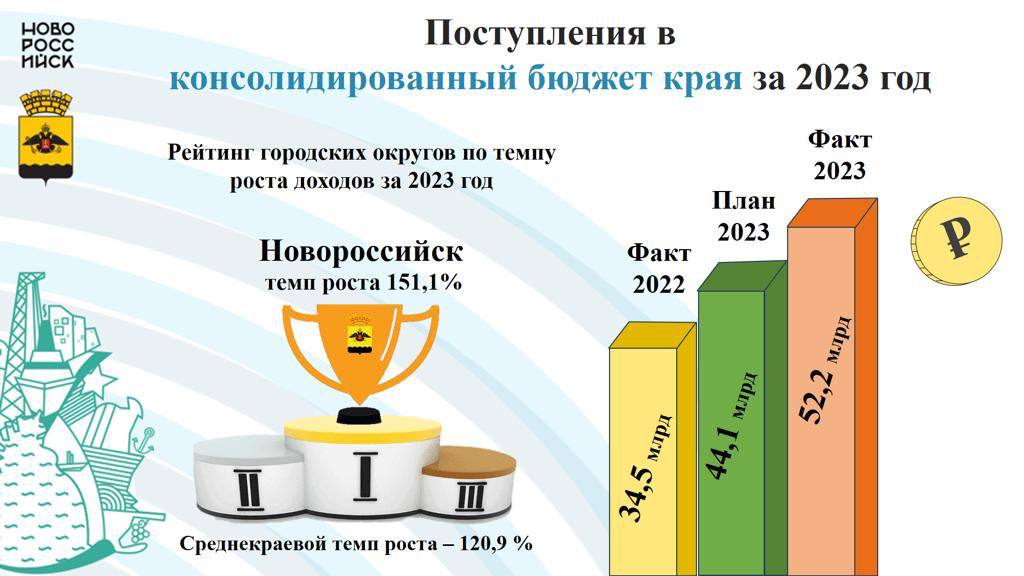 Поступления в консолидированный бюджет края за 2023 год по г. Новороссийску составили 52,2 млрд рублей, темп роста к 2022 году составил 151,1 % или +17,6 млрд рублей при среднекраевом темпе роста, составляющем 120,9%.