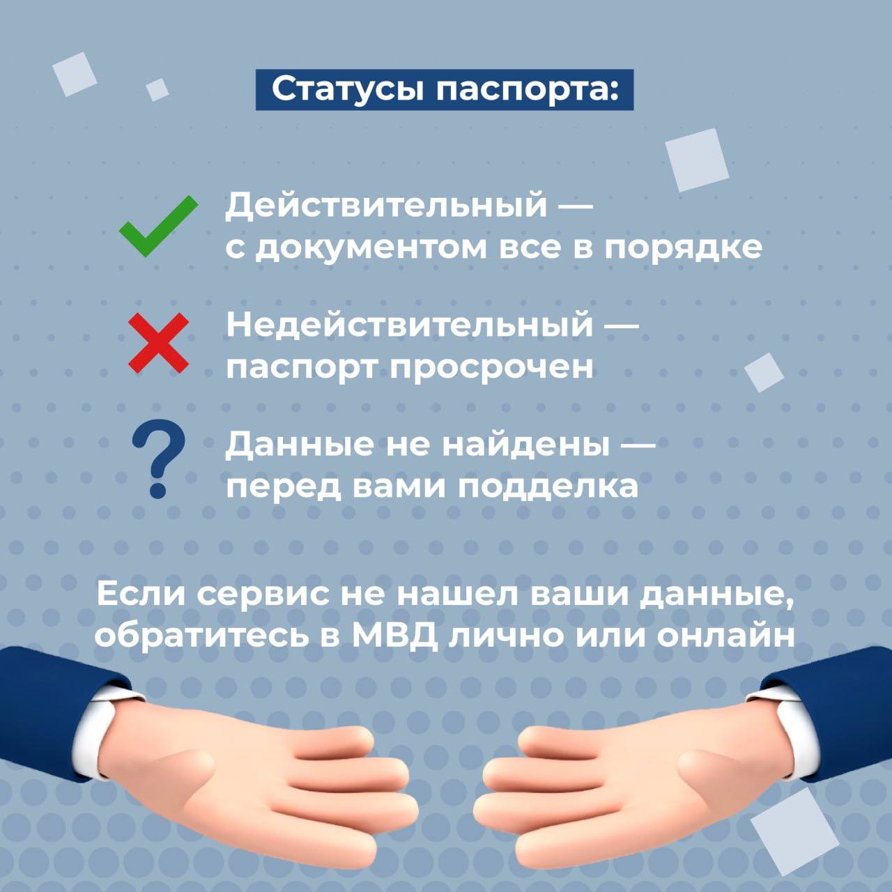 Жители Краснодарского края могут проверить подлинность паспорта на портале «Госуслуги». Новый сервис сверит данные в МВД и определит достоверность и действительность документа Заключать сделки теперь безопаснее — проверить паспорт можно по ссылке https://www.gosuslugi.ru/621102/1/form Подробнее о новом сервисе на портале «Госуслуги» читайте в карточках.